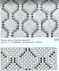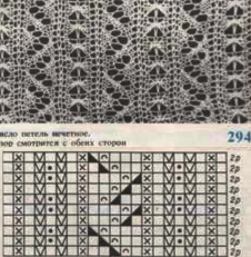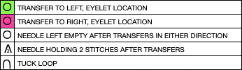 Pubs are not always in agreement as to the significance of specific symbols. In the published chart, the black dots are assumed to indicate stitches in hold or tuck, building up loops on the machine on the associated needles, the black triangles pointing to the left and to the right, the doubled-up stitches after transfers, and the curved shapes, the place where eyelets are formed after needles are emptied.