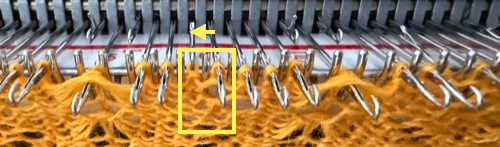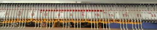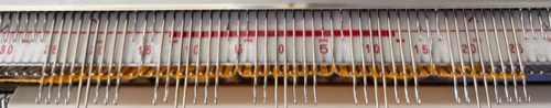 As the carriage returns to the opposite side, an all-knit row will be completed. Several tension adjustments may be needed to ensure loops do not get hung up on gate pegs as stitches move across the bed, while still being loose enough to knit off properly.
