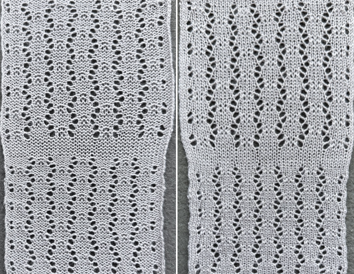 While on one side there is a 2-stitch border, the other has 3, and the eyelets on the 2-stitch side pull in a bit more and appear smaller than those on the opposite side, something to consider in planning finished pieces.