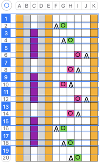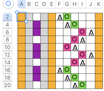 in the table, 20 rows in height, every other row beginning with 1 at the top was hidden; symbols used previously and colored cells were added, including vertical columns in grey for planned needles out of work to heighten the effect of the tuck stitches.