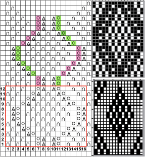 The placement of black and white pixels began to be considered. This 20X20 effort replaces the white pixels in the third column from left with black, the purple with white for tuck stitches. Eyelet locations are marked in black as well. There remain 2 issues. When drawn in repeat in height, there is an error at the center,