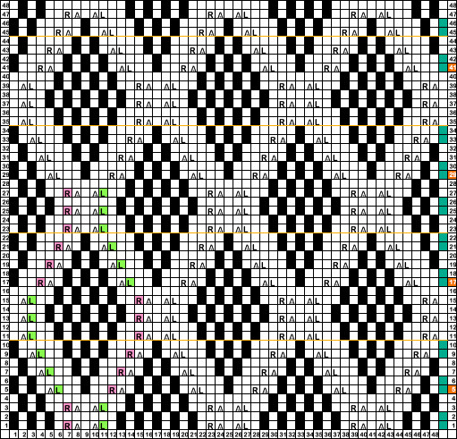 Many of my lace posts use cyan cells to symbolize transfers to the left, magenta for transfers to the right.