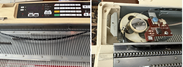 COL: move the knit forward, crochet cast on behind the stitches on the machine with the loop yarn. Knit a row to the right.
