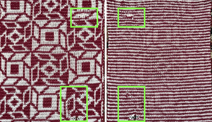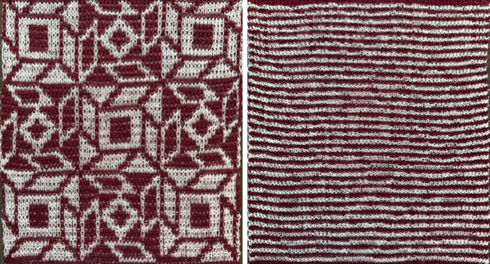 Note the long red loop in the background yarn occurred where the empty needle was not pushed back to the B position during working with sideways loops.